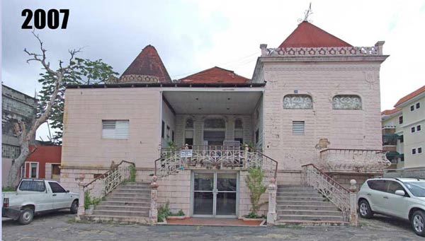 Está en la av. 30 de marzo. Fue diseñado por Osvaldo Báez, uno de los grandes arquitectos del Santo Domingo de principios del siglo XX. Se construyó en 1912, obteniendo en el mismo año el premio del Concurso Municipal de Fachadas, que otorgaba el Ayuntamiento de Santo Domingo. Se le conoció como Casa Amadeo Rodríguez, por su primer dueño, quien por entonces ejercía las funciones de contador general de Hacienda. Sólo durante sus primeros cuatro años operó como residencia plena, ya que desde 1916 –y hasta 1920- se instaló en ella la clínica quirúrgica del doctor venezolano Francisco H. Rivero. Leo estos datos en el primer tomo de “Arquitectura dominicana, 1906-1950”, de Enrique Penson (2006), y al contemplarla en algunas viejas fotos, no puedo menos que advertir la manera en que ha sufrido más en el último lustro que en sus primeros ochenta años de existencia.